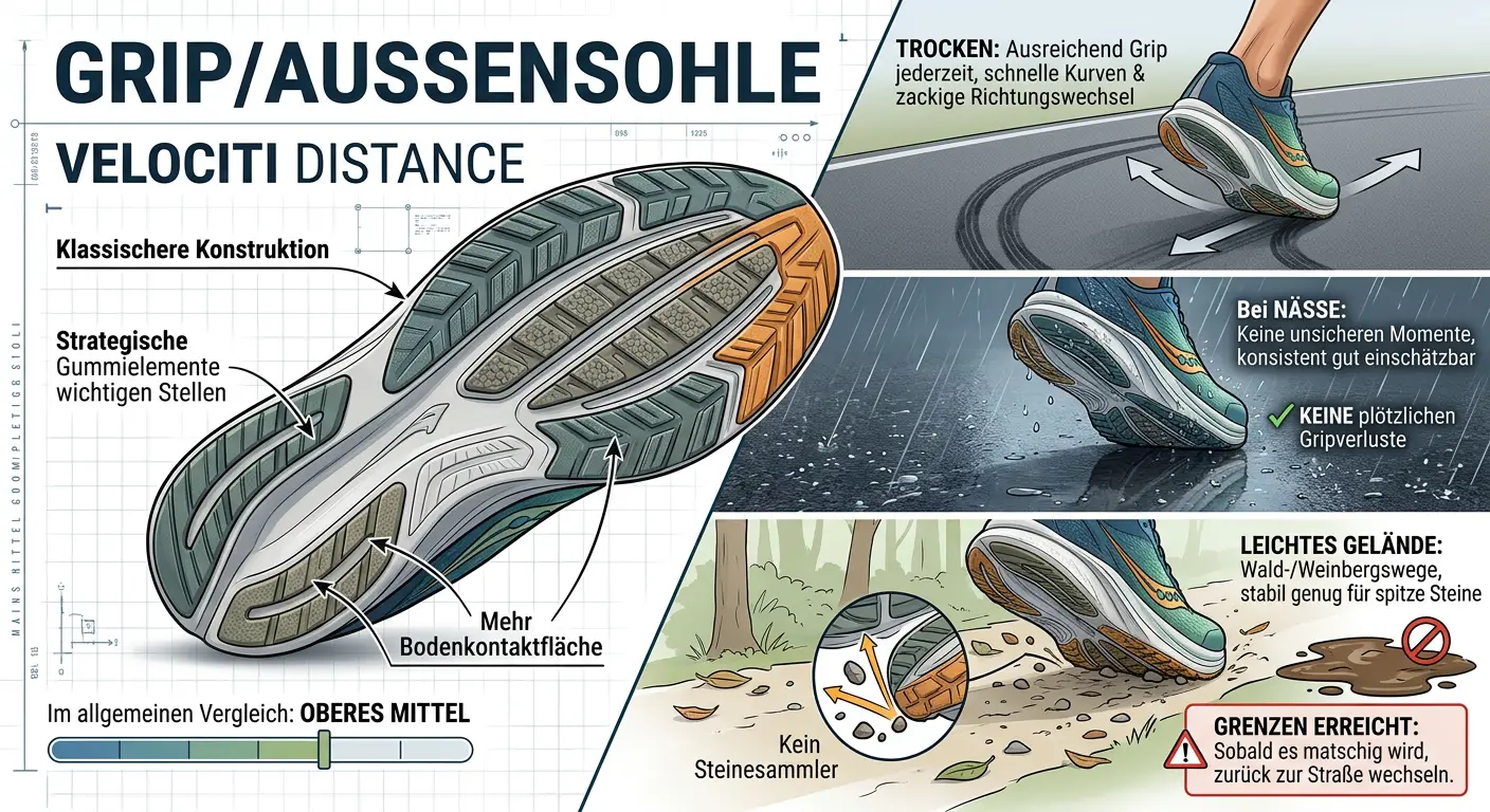 Ein Punkt in vielen Testberichten bei dem z.B. die Flow-Modelle bei Nässe schwächelten, war der Grip auf glattem Untergrund. Der Velociti Distance setzt hier auf eine „klassischere“ Konstruktion mit Gummielementen an den strategisch wichtigen Stellen und mehr Bodenkontaktfläche.
